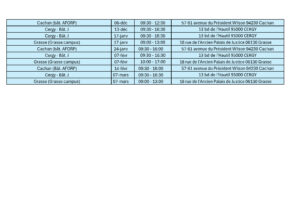 | Paris-Cachan (94) | Samedi 24 janvier 2026 de 09h30 à 16h00 | Samedi 14 février 2026 de 09h30 à 16h00 | |