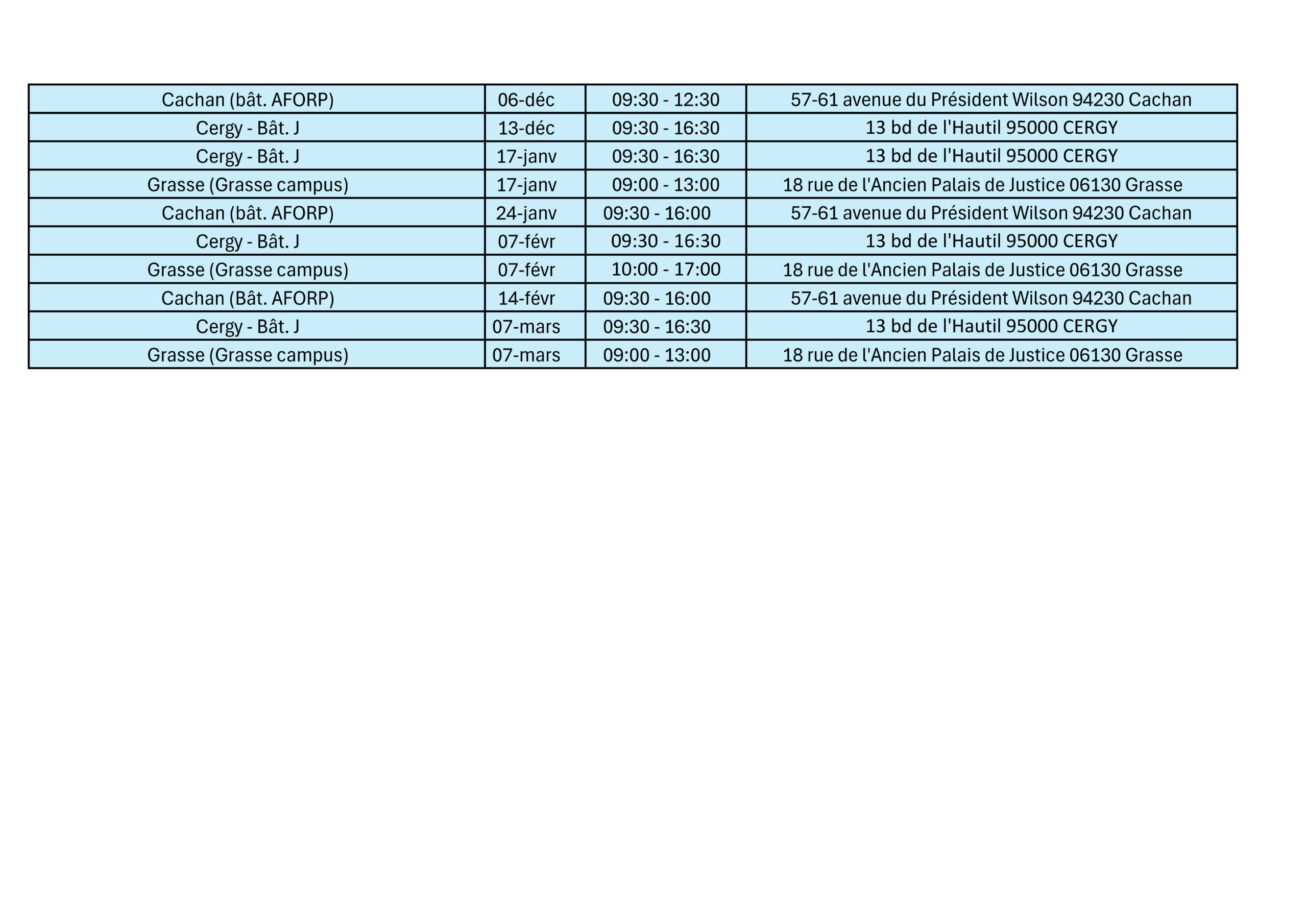 | Cergy-Pontoise (95) | Samedi 17 janvier 2026 de 09h30 à 16h30 | Samedi 07 février 2026 de 09h30 à 16h30 | Samedi 07 mars 2026 de 09h30 à 16h30 |
