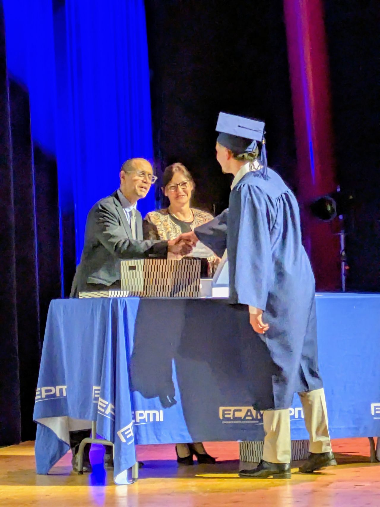 La cérémonie s’est poursuivie par la présentation du programme PQPM (« Une Grande École, Pourquoi Pas Moi ? ») – mené en coopération avec plusieurs établissements du Val-d’Oise et dédié à l’accompagnement de jeunes issus de quartiers défavorisés – par le Président de l’association ÉLAN et M. Thibaut Forvarin, enseignant à ECAM-EPMI et référent du programme PQPM au sein de l’École. À cette occasion, les élèves participant au programme ont été invités à monter sur scène pour recevoir leurs attestations de réussite en présence de la Directrice, du Président de l’École et de la Marraine de la promotion 2025.